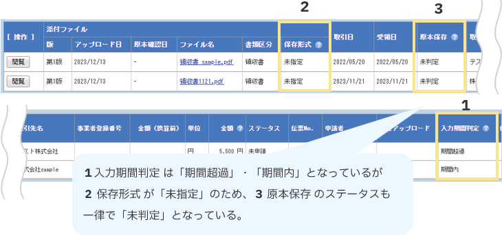 「領収書/請求書」のうち多くで「原本保存」が「未判定」になっている -