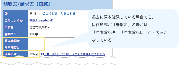 保存形式が「電子取引」の場合は引き続き「原本確認日」「原本確認者」は表示されません。