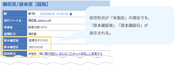 保存形式が「スキャナ保存」・「未指定」の場合「原本確認日」「原本確認者」を表示する仕様