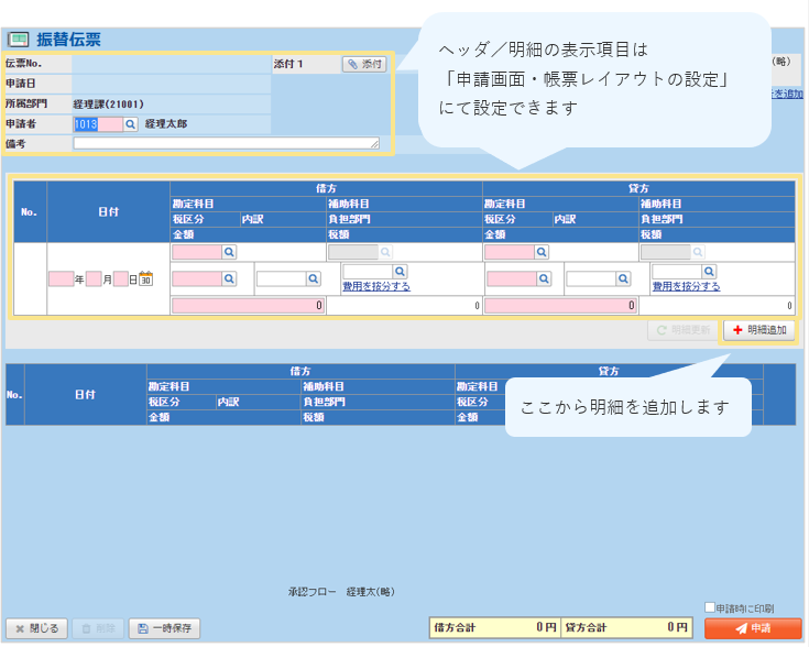- 会計ソフトなどの振替伝票と同様に、借方/貸方の科目情報を自由に設定し、振替仕訳を