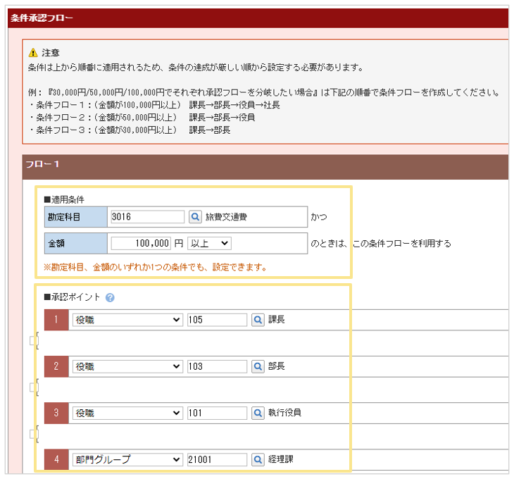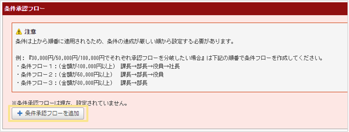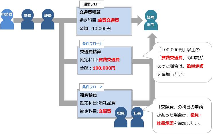 - 「管理」タブ >「承認フローマスタ」の「条件フロー」で設定することができます。