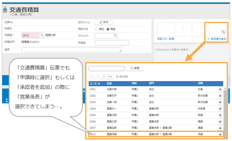 これにより、誤って承認権限がないユーザを承認者として選択することを防ぎ、