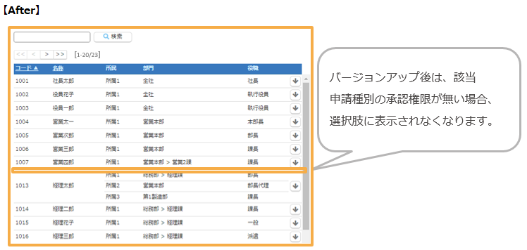 - 変更前:「権限マスタ」 > 権限「承認」にチェックがある社員が表示