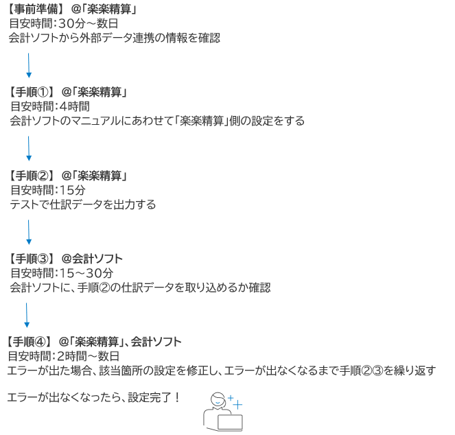 「楽楽精算」のご運用を継続しながら仕訳の設定や、会計ソフトへの連携を進めることができます。