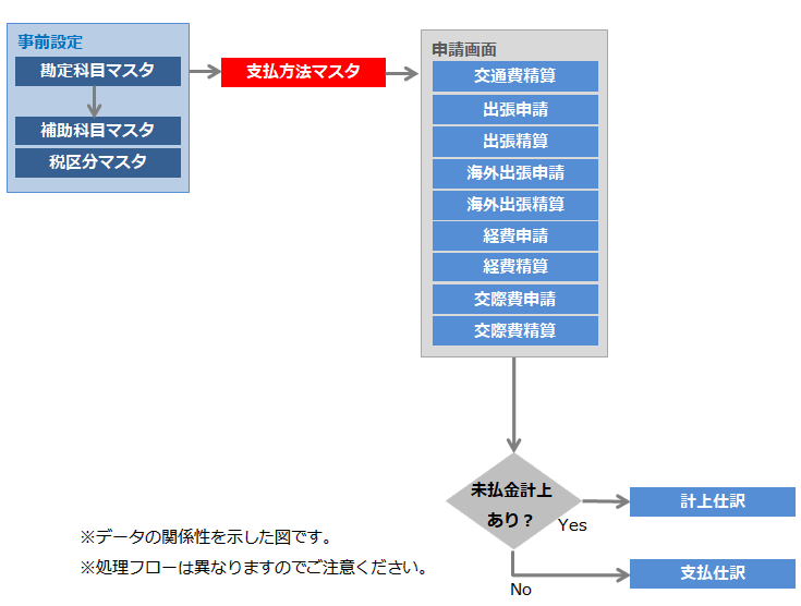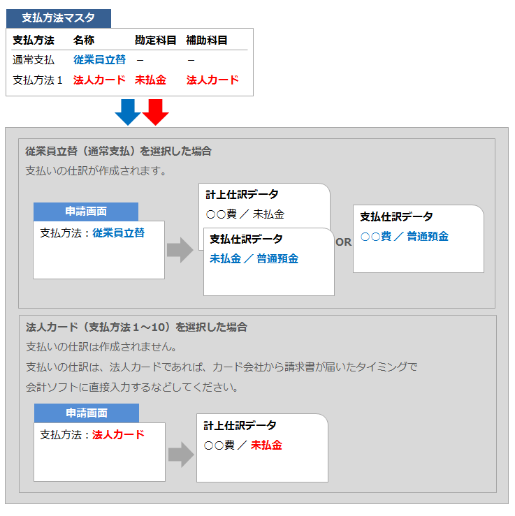- 申請者が「支払方法」を選択することで、自動的に仕訳の貸方が決定します。