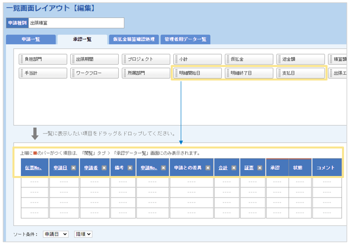 設定は、「管理」タブ >「申請画面・帳票レイアウト」> 一覧画面レイアウトの編集から行います。