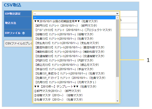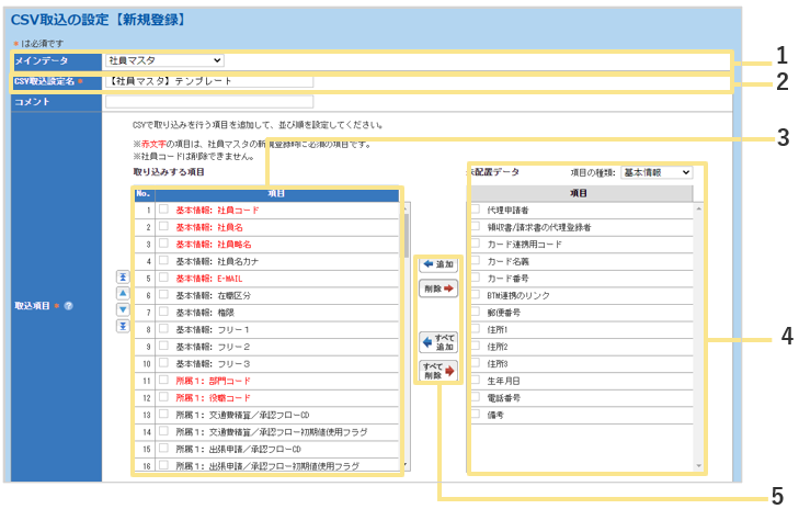 - 「管理」タブ >「CSV取込の設定」メニューの画面と機能を説明します。