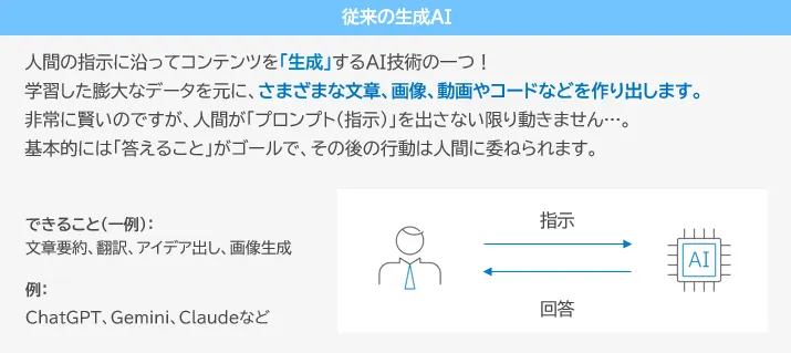 ▶ そもそも「生成AI」と「AIエージェント」何が違う?