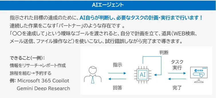 | 役割 | データやコンテンツの生成 | 業務の計画・実行 |