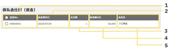 「仮払金の繰越」を「許可する」設定にしている場合のみ表示されます。 - 仮払金の返金仕訳は社員ごとに仕訳がわかれて作成されます。