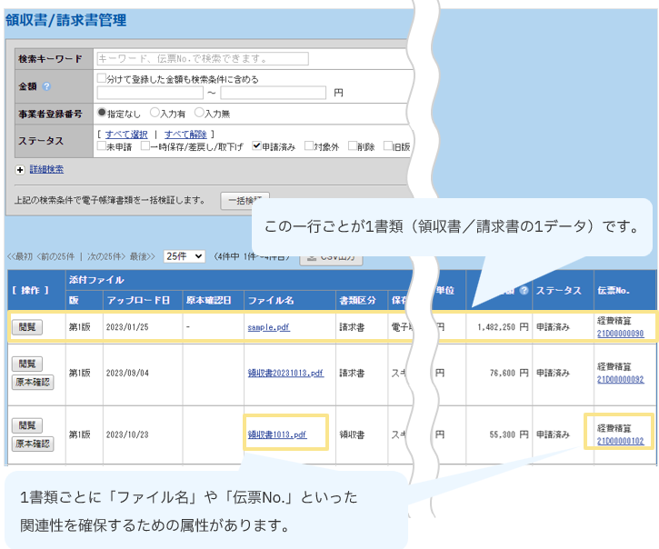 また、伝票No.およびファイル名を「検索キーワード」に指定して、対象の領収書/請求書を