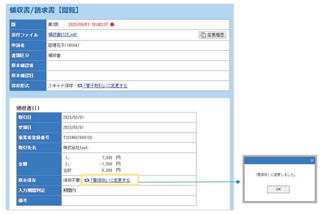 判定するため、「原本確認」ボタンをクリックしても原本保存の要否には影響しません。 - 「原本確認」ボタンは、保存形式が「スキャナ保存」または「未指定」の場合に表示され