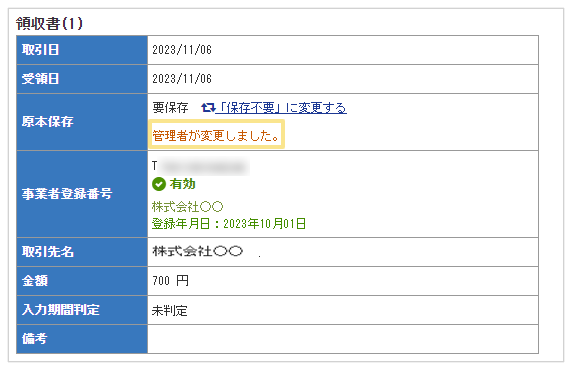 領収書/請求書の原本保存要否(要保存/保存不要)を表示します。