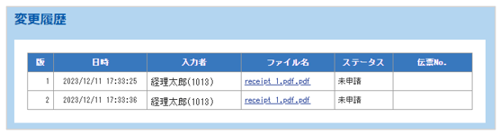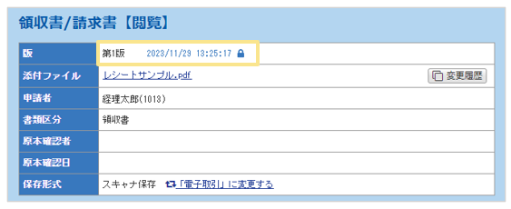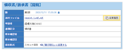 ※削除済みの領収書/請求書の「閲覧」>「変更履歴」にてすべてのバージョンに関する