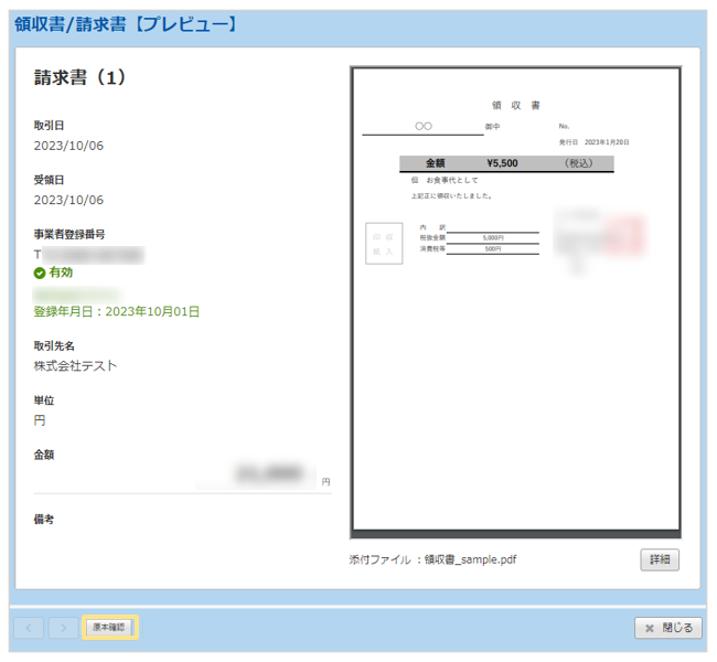 - 原本確認を行えるのは、領収書/請求書の一版につき一度のみです。