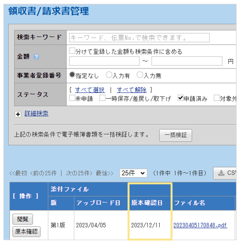※「領収書/請求書管理」の一覧画面上には「原本確認日」のみ表示されます。(画像↓)