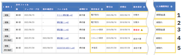 1:入力期間判定は「期間超過」であるが、保存形式が「電子取引」のため原本保存は「対象外」