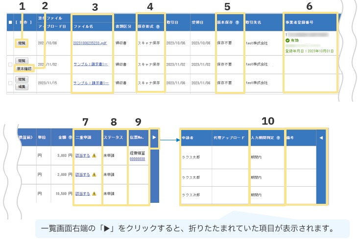 アップロード者、申請者、取引日、受領日、アップロード日、金額、書類区分、原本保存、