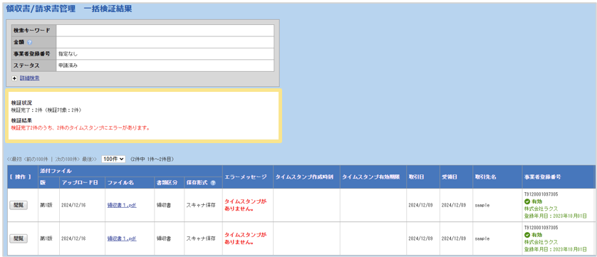 ・電子帳簿書類の一括検証を行い、電子帳簿保存法の保存要件を満たしているかを確認できます。