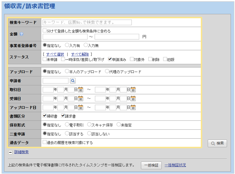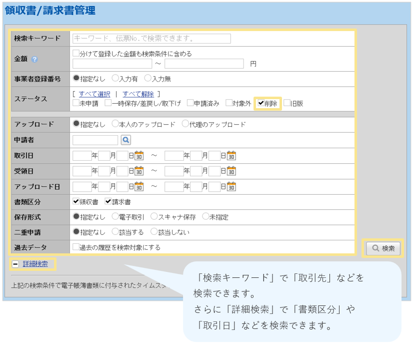- 「キーワード」「金額」「事業者登録番号」「ステータス」、詳細検索の「取引日」
