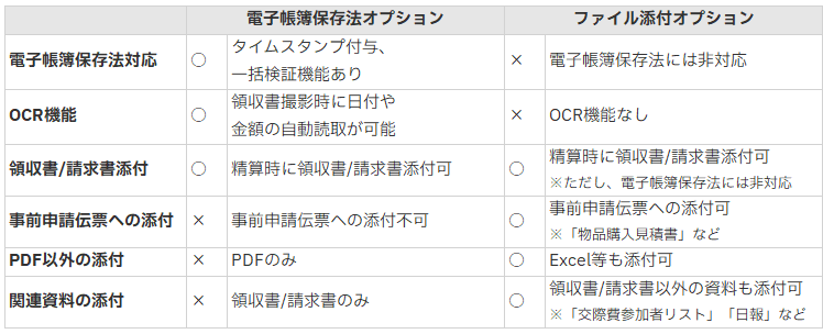 電子帳簿保存法オプションとファイル添付オプションの違いを知りたい