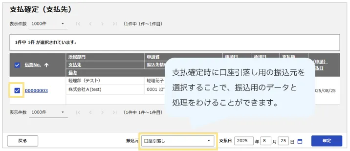 「支払確定」の際に口座振替用の振込元を選択すれば、FBデータを出力せずに処理が可能です!