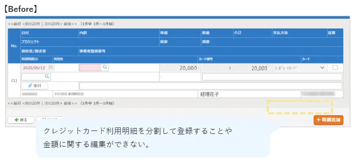 - 1つのクレジットカード利用明細は、伝票明細に最大20件まで分割が可能です。