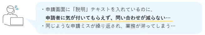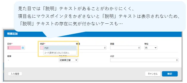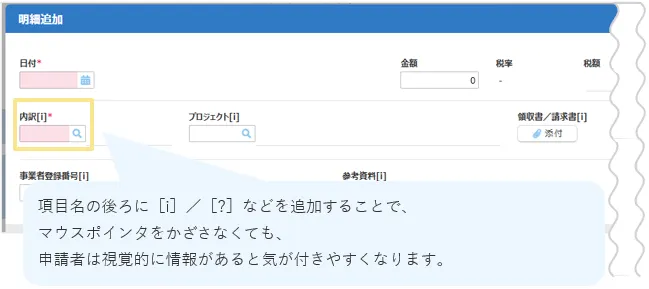 申請画面のヘッダや明細の項目に、申請時の注意事項などの「説明」テキストを表示はしているものの、「そもそも、説明があることに気づいてもらえない…」というお声をよく聞きます。