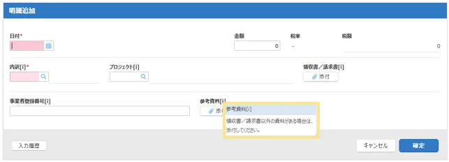 | 参考資料[i] | 領収書/請求書以外の資料がある場合は、 添付してください。 |