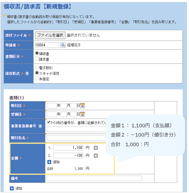 | 【例】本来の支払額は1,100円だったが、値引きが100円発生したため、 結果的に精算額が1,000円である領収書を新規登録する場合 |