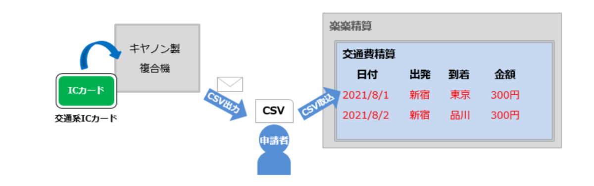 概要 ▶キヤノンMJ製 複合機アプリ「MEAP 交通費申請」とは イメージ図 「MEAP 交通費申請」からCSV出力する項目 「楽楽精算」の設定方法 ▶設定手順 取込手順 ▶複合機(MEAP 交通費申請)側の手順 ▶「楽楽精算」側の手順 |