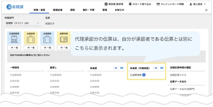 本来承認者として表示される「未承認」欄とは別に、「未承認(代理承認)」欄が表示されます。