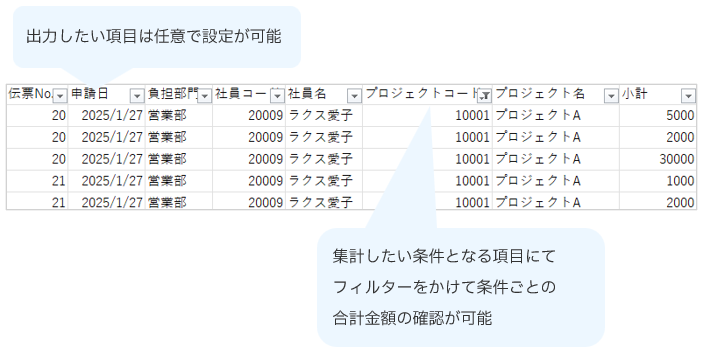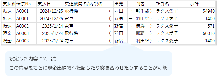 「支払No.」や「支払日」ごとに、社員や支払先に支払った金額の一覧を出力できます。