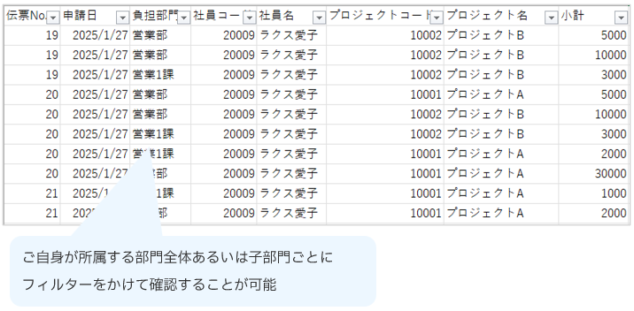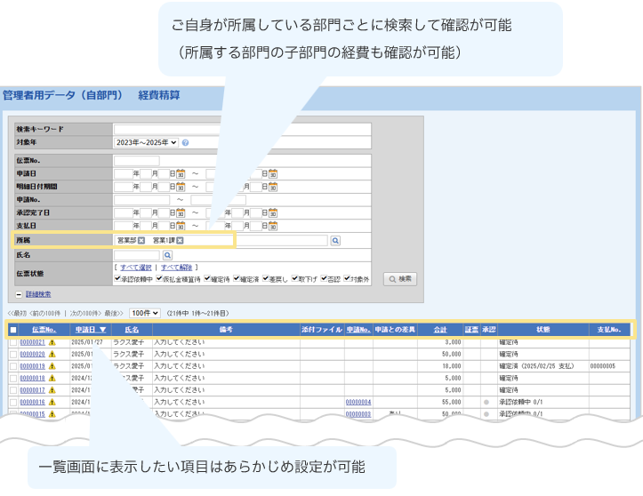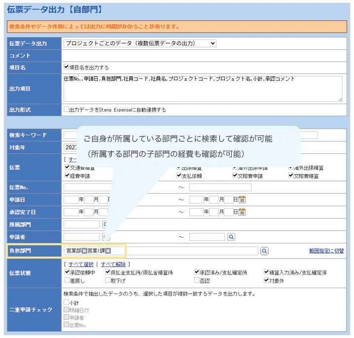 伝票データを申請種別ごと・部門ごとに確認できる機能です。