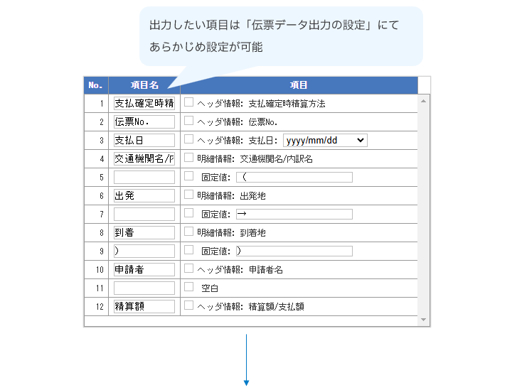 項目を自由に設定できるため、仕訳データとして出力したい内容とは別途