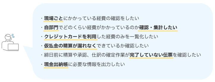 ▶現場ごとや内訳ごとなどの特定の条件において発生している経費を集計したい ▶自部門でどのくらい経費が発生しているのか確認・集計したい ▶クレジットカードを利用した経費のみを一覧化したい ▶事前に支払った仮払金の事後精算の漏れがないか確認したい ▶締日前などに精算や承認、仕訳の確定作業が完了していない伝票を確認したい ▶現金出納帳に必要な情報を出力したい |