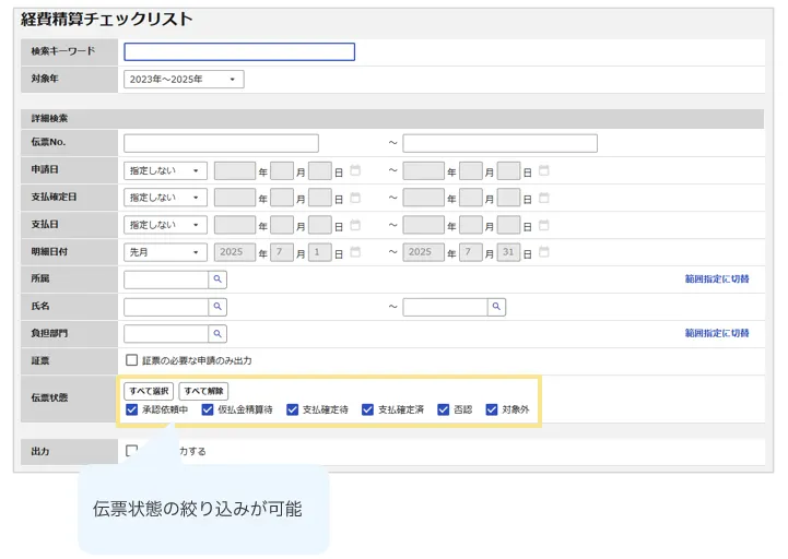 締日前などに精算や承認、仕訳の確定作業が完了していない伝票を確認する場合に