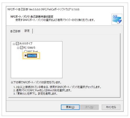 ※「NFCポート自己診断」ではなく「NFCポート自己診断(ドライバ切り換え)」を選択します。 - 「設定」タブを開き「WinUSB」にチェックし「更新(U)」をクリック