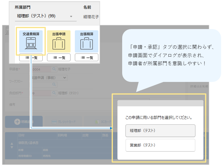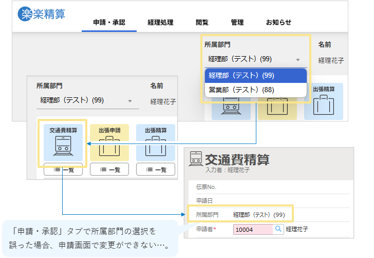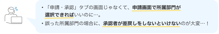 複数部門に所属している申請者が、誤った所属部門で伝票を申請してしまう、