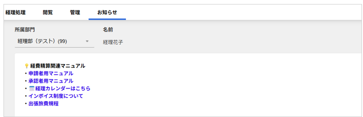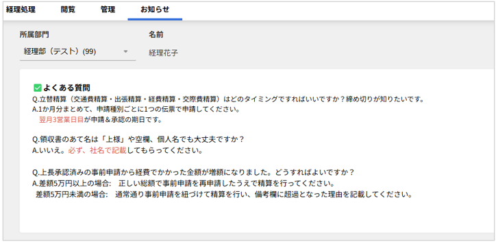 社員の方から多く寄せられる、よくある質問を「お知らせ」タブにまとめる活用方法です。
