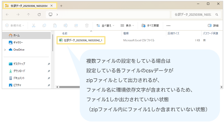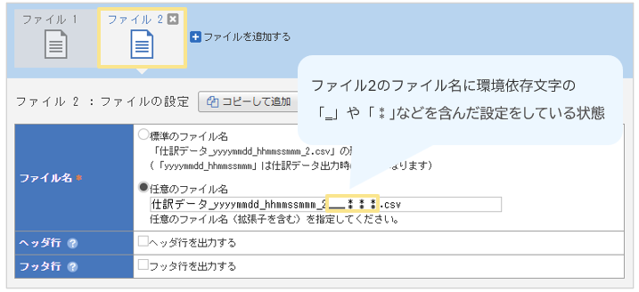 「仕訳データ出力の設定」において出力するファイルを複数設定しており、ファイル名に環境依存文字が含まれている場合にファイルが出力されない事象について