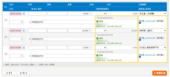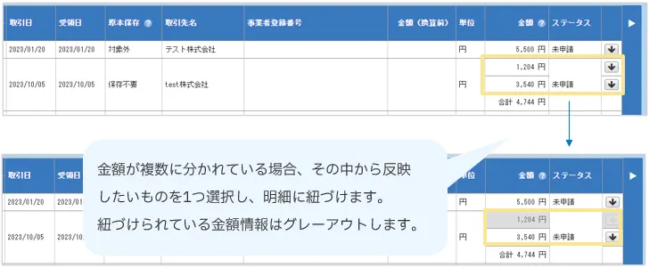 金額や日付の異なる明細が自動で作成され、一括でそれらの明細に領収書/請求書を添付できます。