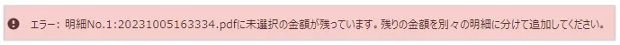 そのため、上記の方法で紐づけを行った際に、未選択の金額が残っている状態で「申請」をクリックすると以下のようなエラー画面が表示されます。