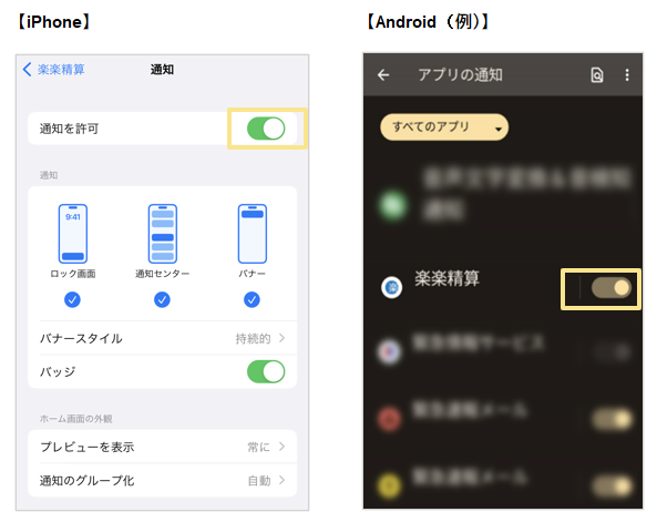 「設定 > 通知 > アプリの設定 > すべてのアプリ > 楽楽精算」の 設定を確認してください。