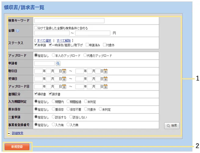 ※事業者登録番号の有無で領収書/請求書を検索することもできます。