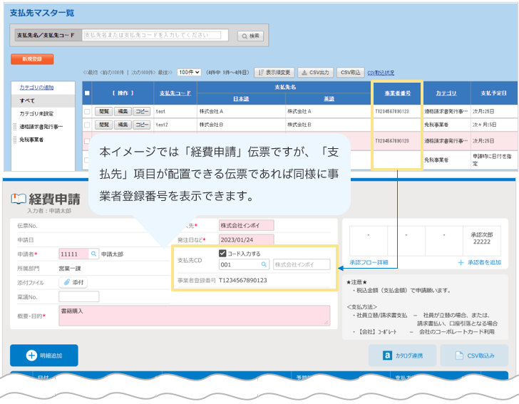 「事業者登録番号」欄を表示させ、「支払先マスタ」に登録された「事業者登録番号」を